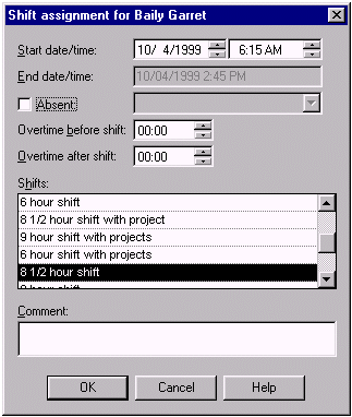 在這個模版中,顯示了員工Garret在1999年11月4日的個人日歷,里面體現(xiàn)了Garret從早上6:15到下午14:45的正常工作時間。