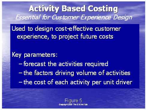 圖7說明了管理組眼中的傳統(tǒng)的成本可以怎樣分配到各行動和成本對象上去,以至于最后收入的真實(shí)成本可以在不同的客戶群上得以體現(xiàn)。下面的圖表顯示了以地理劃分的客戶群,但是很可能分配成本對象到其它的客戶群方案里,如人口統(tǒng)計(jì)學(xué)群體,銷售渠道(零售,互聯(lián)網(wǎng),代理)或其它的設(shè)計(jì)客戶經(jīng)驗(yàn)的有用的種類中。