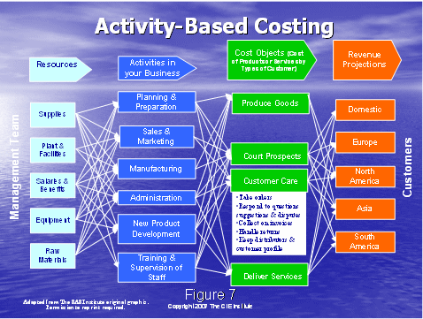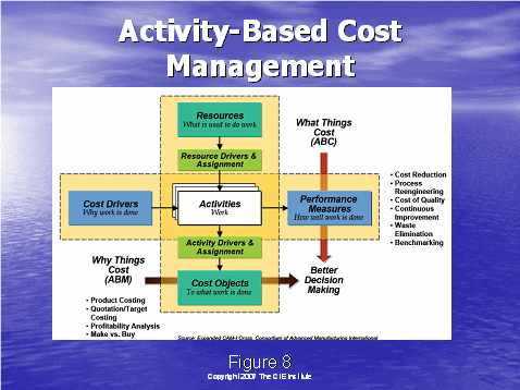 通過了解圖8,我們將以行動成本管理大體是什么的總括作為結(jié)束。我們從左邊的成本驅(qū)動因素開始——這是做工作的原因,例如:獲得客戶,維持客戶。就如圖4中所說的,這些成本驅(qū)動因素可以細(xì)分到工作行動上去?梢酝ㄟ^描述人,培訓(xùn),設(shè)備和技術(shù)資源來組成工作行動。資源驅(qū)動因素被用于分配這些企業(yè)成本到各個(gè)行動上去。下一步就是系統(tǒng)地確定行動驅(qū)動因素,分配行動成本到成本對象上去,這有利于決策的制定。例如,獲得一個(gè)客戶和維持一個(gè)客戶需要花費(fèi)多少的成本?