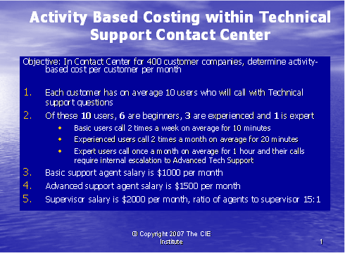 呼叫中心業(yè)務(wù)包括大量單獨的行動 — 行動成本法(ABC)使我們跟蹤那些行動以至于更清楚地了解支持一個客戶的所需事項。傳統(tǒng)上,呼叫中心成本是根據(jù)投入來衡量的:人數(shù),設(shè)備量,設(shè)施的規(guī)模。為了了解服務(wù)一個客戶所花費的成本量,呼叫中心的主管必須確定這些行動如何與該客戶相聯(lián)系的。只有做到這一點,行業(yè)才能知道來自該客戶的收入是否超出為其提供服務(wù)所產(chǎn)生的成本。如果服務(wù)的成本大于收入,那么這個客戶對于行業(yè)來說是無利可圖的,所以確定哪些客戶有利可圖和哪些客戶無利可圖是很重要的,這樣,行業(yè)才可以根據(jù)客戶定價和客戶服務(wù)策略有利地進(jìn)行管理。