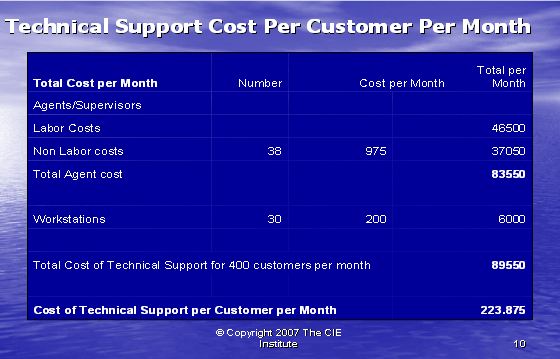 根據(jù)圖表12,我們可以算出第二種方式的利潤百分比。如果我們假設(shè)每個客戶每年的收入是20,000美元,其中分配給呼叫中心部門的收入是20%。我們每個客戶每月的收入是333.33美元,每個客戶月的成本是223.88美元(參見圖表10)。這導(dǎo)致我們來自每個客戶每月的利潤是109.46美元——這將產(chǎn)生33%的利潤率。
