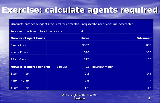 我們現(xiàn)在可以轉(zhuǎn)向下一階段的運算,這一運算決定我們需要多少座席去支持400個客戶。由于技術(shù)支持呼叫中心一天24小時,一周7天進(jìn)行運營,以及座席必須三班倒工作,使問題更為復(fù)雜。通過測量一天當(dāng)中的話務(wù)量,我們發(fā)現(xiàn)80%的電話聚集在上午八點到下午四點的時間段,15%的電話聚集在下午四點到午夜的時間段,還有5%則在午夜到上午八點的時間段。因此,現(xiàn)在我們用該信息去計算每個排班中所需要的通話時長。表3表明了根據(jù)基礎(chǔ)和高級支持需要而為我們計算出的小時數(shù)。