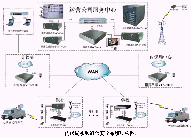 針對以上情況,北京華緯訊電信技術(shù)有限公司基于最新推出的VC3-6000綜合視頻通信平臺提出了針對性的"城市安保聯(lián)動視頻通信平臺"解決方案。該平臺整合多種資源,實現(xiàn)了視頻指揮調(diào)度、遠程視頻監(jiān)控、視頻會議、視頻點播、無線移動視頻接入、高清晰圖片傳輸和環(huán)境監(jiān)測等功能。平臺組成如下圖: