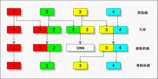 當(dāng)?shù)?個(gè)包在傳輸過程中丟失時(shí),由于包“3”被冗余編碼到第4個(gè)傳輸包中,在對端接收到碼流后還可以正常重構(gòu)出包“3”。