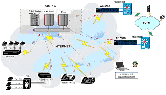 無論大型企業(yè)用戶(通過PBX接入網(wǎng)關(guān)設(shè)備)、小型企業(yè)用戶(使用網(wǎng)關(guān)設(shè)備)還是其它使用單口網(wǎng)關(guān)或IP Phone的用戶,都可以通過各種接入方式接入到ECM3.0網(wǎng)絡(luò)中,并通過PROXY及MEDIA