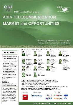 2006亞洲信息及通信技術(shù)展覽會(huì),即亞洲CeBIT展將于今年9月17日至20日在上海新國際博覽中心召開。由中國國際貿(mào)促會(huì)電子信息行業(yè)分會(huì)與德國漢諾威展覽公司聯(lián)合主辦的這一展會(huì),近300家國內(nèi)外廠商參展,將分為數(shù)字設(shè)備及系統(tǒng)、商務(wù)應(yīng)用、通信三大展區(qū),多方位展現(xiàn)ICT行業(yè)的最新趨勢(shì),并成為業(yè)內(nèi)廠商的專業(yè)貿(mào)易平臺(tái)。本次CeBIT展會(huì)期間(9月18、19日兩天),將在浦東證大麗笙酒店召開“2006亞洲通信及信息市場(chǎng)管理層論壇”。包括中國國家信息產(chǎn)業(yè)部、中國電信、韓國SK電訊、BDA中國等多家政府機(jī)關(guān)、運(yùn)營商、制造商將參加本次論壇,并做重要發(fā)言。
