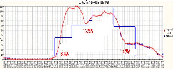 大家看到圖一中紅色的線,就是一天里面電話進(jìn)來的數(shù)量,藍(lán)色的線是安排的人力?梢郧宄吹剑涸缟8點(diǎn)一開始,電話就一直進(jìn)來;中午來電的客戶開始去吃飯,電話就開始下滑;然后等到客戶吃完中飯,電話又開始進(jìn)來,下午又出現(xiàn)另外一個(gè)高峰;一直到5點(diǎn)以后又開始下滑,6點(diǎn)以后電話相對(duì)就少很多。
