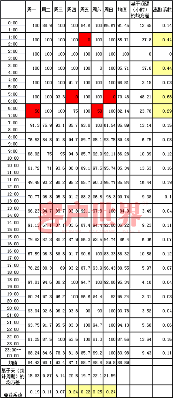 針對(duì)平均服務(wù)水平的不足,大家開(kāi)始采用服務(wù)水平均方差來(lái)衡量運(yùn)營(yíng)的好壞。服務(wù)水平均方差又分為兩種,一種是按時(shí)間間隔的均方差分析,即統(tǒng)計(jì)相同時(shí)間間隔在不同日期間的服務(wù)水平均方差;一種是按統(tǒng)計(jì)周期的均方差分析,即統(tǒng)計(jì)周期內(nèi)不同時(shí)間間隔的均方差。