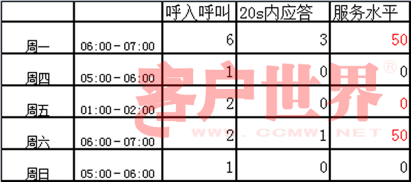附表1是某一客服中心在一周內(nèi)分時(shí)段服務(wù)水平的詳細(xì)數(shù)據(jù),通過(guò)統(tǒng)計(jì)平均值及均方差,可以很清晰的看出問(wèn)題所在。以基于統(tǒng)計(jì)周期的均方差為例,很明顯周四到周日的離散系數(shù)偏高,可以很明顯的看出,這幾天或者是人力安排有問(wèn)題,或者是話務(wù)有異常。而從基于時(shí)段的均方差來(lái)看,凌晨(0:00-7:00)出現(xiàn)異常的幾率最大。結(jié)合均值和均方差可以很方便的分析出呼叫中心的宏觀狀態(tài),但是,要想對(duì)呼叫中心業(yè)務(wù)運(yùn)營(yíng)有所幫助,必須進(jìn)行進(jìn)一步的分析。即結(jié)合業(yè)務(wù)及話務(wù)量實(shí)際形態(tài)進(jìn)一步分析。還以附表1為例,如果僅以均方差分析,由于凌晨服務(wù)水平離散系數(shù)大,部分區(qū)間服務(wù)水平為0,是不是夜班需要加人呢?讓我們?cè)倏纯催@幾個(gè)異常時(shí)段的話務(wù)。
