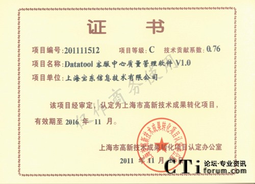 CTI論壇(ctiforum)12月7日消息(記者 張潔):2011年的最后一個(gè)月,寶東公司傳來又一好消息,公司的開發(fā)團(tuán)隊(duì)自主開發(fā)研制的針對(duì)呼叫中心客服的質(zhì)檢軟件“Datatool 客服中心質(zhì)量管理軟件(簡稱DTQM)”經(jīng)過市高新技術(shù)轉(zhuǎn)化項(xiàng)目認(rèn)定辦公室層層審報(bào)審批,最終經(jīng)審定,被認(rèn)定為市高新技術(shù)成果轉(zhuǎn)化項(xiàng)目。