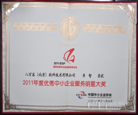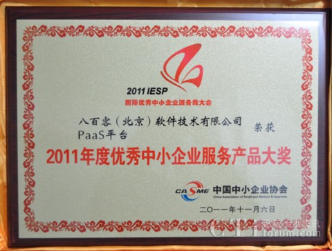 作為國內(nèi)首家SaaS廠商,八百客積極推動云計算在中小企業(yè)中的宣傳與運(yùn)用。2006年,八百客在國內(nèi)率先推出管理自動化開發(fā)平臺800APP, 它擴(kuò)展了按需服務(wù),并實(shí)現(xiàn)了客戶可根據(jù)需要自定制應(yīng)用程序,成為了改變應(yīng)用程序開發(fā)的一個新途徑。為表彰八百客在中小企業(yè)信息化中做出的杰出貢獻(xiàn),本次大會特別為八百客頒發(fā)了“2011年度優(yōu)秀中小企業(yè)服務(wù)產(chǎn)品大獎”,此外還授予八百客總經(jīng)理李智 “2011年度優(yōu)秀中小企業(yè)服務(wù)明星大獎”。