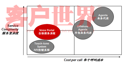 讓我們來看看這張圖。這張圖縱軸是服務(wù)的復(fù)雜度,橫軸是單位呼叫成本,傳統(tǒng)的IVR(觸鍵的語音IVR)和人工服務(wù)相比,服務(wù)的復(fù)雜度可就差多了。而Voice Portal的概念是用比較少的成本做更多的業(yè)務(wù),從成本上講比原來的傳統(tǒng)的IVR可能成本稍微高一點(diǎn)點(diǎn),但是和人工服務(wù)相比,無論是和單位自建呼叫中心座席比,還是和外包呼叫中心座席比,成本都有很大降低,但業(yè)務(wù)復(fù)雜度可以做得比傳統(tǒng)IVR復(fù)雜很多。我們承認(rèn),就提供服務(wù)的內(nèi)容來講,Voice Portal今天仍然不能夠像人工那樣提供那么全面的服務(wù),但是可以涵蓋很多服務(wù)內(nèi)容,在這方面一是因?yàn)榧夹g(shù)先進(jìn)了,另一方面也在于引導(dǎo)。今天我看到越來越多的客戶已經(jīng)開始有意識(shí)的推行自助服務(wù)形式。我前幾年去新加坡打出租,發(fā)現(xiàn)在新加坡有很多叫出租的車站,車站上有一個(gè)按鍵,按鍵上有一個(gè)編碼,說明你在什么位置,當(dāng)你打通出租車客服的電話,你只要告訴這個(gè)編碼,他們就自然而然知道你在什么地方,并把要來接你的車車牌號(hào)通過語音報(bào)讀方式通知你。今天在中國(guó)也開始有這種形式了。昨天我沒有開車,也算是支持北京市每周少開一天車的號(hào)召,我打了出租,在和出租司機(jī)聊天的過程中,出租司機(jī)說現(xiàn)在油價(jià)很貴,他們有很強(qiáng)烈的需求不愿意掃馬路,他們也有一個(gè)出租車叫車電話,那個(gè)呼叫中心大概有上百個(gè)坐席,這個(gè)公司有一萬六千輛出租車在北京,由他們來進(jìn)行搶答,搶答完之后你可以告訴說這個(gè)人在什么地方等,唯一不同的我們?cè)谧灾线沒有做得那么到位,司機(jī)搶到了活還要給客戶打一個(gè)電話,不象新加坡完全是自助的,你只要按了那個(gè)鍵,系統(tǒng)就知道你在什么地方,當(dāng)尋找到合適的車的時(shí)候,語音報(bào)讀你車牌號(hào)就行了。我和說出租車師傅,那你打電話成本不是增加了嗎,他一笑,增加打一個(gè)電話的成本怎么也比掃馬路強(qiáng)。大家可以看看呼叫中心多有用,自助服務(wù)能省多少錢。