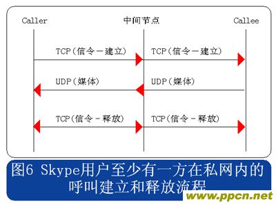 從上述流程圖可見,Skype的呼叫信令都采用TCP封裝,而媒體流則使用UDP封裝,當(dāng)有任何一方用戶位于限制UDP包的防火墻內(nèi)時,媒體流就會采用TCP封裝。另外當(dāng)Skype用戶至少有一方位于私網(wǎng)內(nèi)時,所有的信令和媒體消息都經(jīng)過一個或多個中間節(jié)點轉(zhuǎn)發(fā)。此時無需擔(dān)心用戶通話的媒體流因為經(jīng)過中間節(jié)點轉(zhuǎn)發(fā)而被竊聽,因為Skype采用了對消息進(jìn)行端到端加密的機(jī)制。