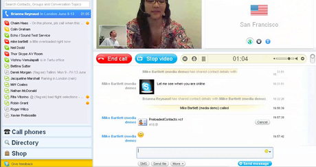 顯著的一個大改變是,軟件界面變成了全屏,而視頻窗口又占據(jù)了絕大部分版面。在視頻中還有“畫中畫”的功能,小的畫面可以任意移動?梢哉fskype從一部網(wǎng)絡(luò)電話,變成了一部網(wǎng)絡(luò)可視電話;蛘撸孟窀杏X是在視頻聊天室中一樣。