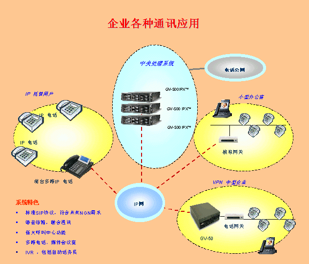 將訊時捷?IPX放在公司總部,其它分支機構可以通過IP話機,軟電話或者網(wǎng)關設備登錄到總部的IPX上,這樣就形成了整個公司的VOIP網(wǎng),建立了企業(yè)自己的通訊平臺。