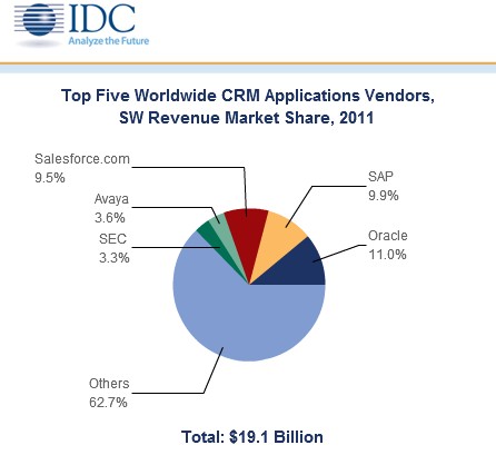 根據(jù)IDC的調(diào)查數(shù)據(jù)顯示,目前就CRM市場(chǎng)來(lái)說,Salesforce和SAP正呈現(xiàn)出一種超越甲骨文,奪取領(lǐng)頭羊?qū)氉内厔?shì)。