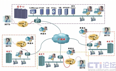 如上圖所示,由于Cisco IPCC是基于標(biāo)準(zhǔn)IP網(wǎng)絡(luò)的純IP呼叫中心解決方案,呼叫中心的核心設(shè)備都只部署在省中心機(jī)房,其它地市只需要在原有網(wǎng)絡(luò)的路由器上添加語音模塊即可實現(xiàn)PSTN語音的本地接入,而無需再各地市購買額外的接入設(shè)備。而同樣由于IP網(wǎng)絡(luò)的特性,呼叫中心的坐席可以根據(jù)需要部署在甘肅省運輸管理局IP網(wǎng)絡(luò)可達(dá)的任何一個地方,各地市的坐席只需要配備IP電話和座席PC即可。來自PSTN的電話根據(jù)用戶在IVR中的選擇和其它路由策略,自動分配到最適合的坐席處理,譬如來自白銀的運政投訴由白銀市本地的運政大廳座席人員處理。