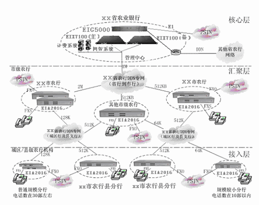 省行、各地市行與縣支行、分理處與數(shù)據(jù)業(yè)務(wù)共用專網(wǎng)線路,實現(xiàn)VOIP互連,形成一個全省范圍內(nèi)的VOIP大網(wǎng),實現(xiàn)全省內(nèi)部語音的免費通信和內(nèi)部號碼的縮位拔號,節(jié)省了各行間的市話費用,節(jié)省大量長途話費。各節(jié)點按FXO:FXS