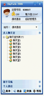 聊天室的秩序一直以來是增值業(yè)務經營者頭疼的問題,"Skytalk IM(天語通)"實時強勁的監(jiān)聽、禁止發(fā)言、拆線、踢人等功能使此難題從此迎刃而解。強大快捷的遠端聊天室管理功能,保證了聊天室秩序活躍而又有序,熱鬧而不胡鬧。