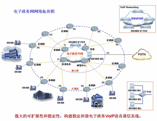 MG和BN2000 IP PBX就可以利用電子政務(wù)網(wǎng)自身的優(yōu)勢,實現(xiàn)VoIP語音通信。電子政務(wù)網(wǎng)內(nèi)的所有IP電話用戶統(tǒng)一在核心層的BN2000
