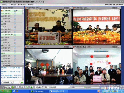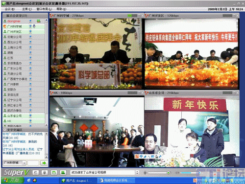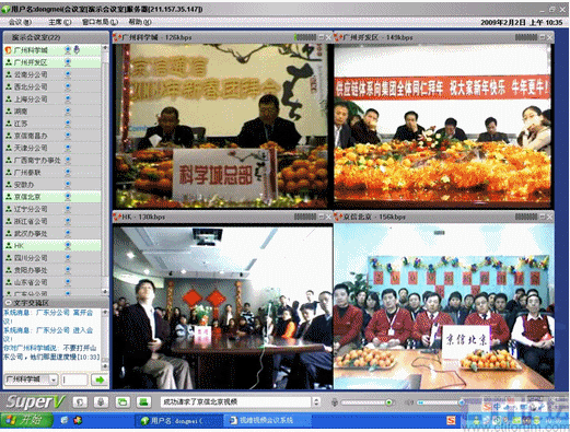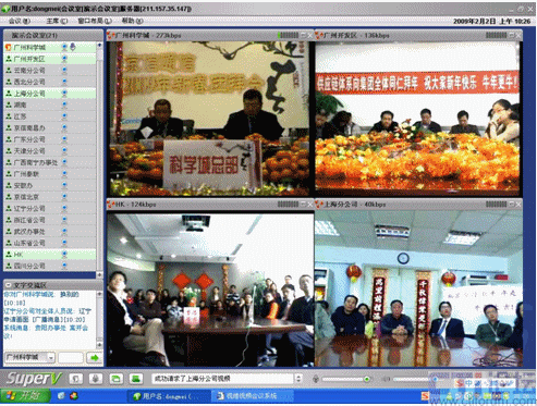 春節(jié)是中華民族的傳統(tǒng)的節(jié)日,尤其是跨國企業(yè)集團,身在海外的游子們,這一刻多么期待與在國內的親人、朋友、以及同事網(wǎng)絡“面對面”的過春節(jié);因此,一些企業(yè)用視維視頻會議舉辦了別開生面的視頻拜年會。其中京信通信公司視頻年會尤為精彩,廣州科學城的主會場、廣州開發(fā)區(qū)、香港、北京、上海、西北分公司、武漢等20多個分公司通過視維視頻會議互拜大年,通過網(wǎng)絡視頻,遠隔千里一樣可以“面對面”的送上新春祝福。如下圖: