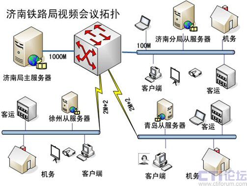 由于路局改革后組織結(jié)構(gòu)的特點(diǎn),決定了跨地域會(huì)議較多,如濟(jì)南和徐州、青島之間召開的部門級(jí)別的會(huì)議比較頻繁,加上三地之間的帶寬制約,本方案建議采用主從服務(wù)器的系統(tǒng)架構(gòu),1主3從,主服務(wù)器設(shè)置在路局網(wǎng)絡(luò)中心,原來濟(jì)南分局位置設(shè)置1臺(tái)從服務(wù)器,負(fù)責(zé)濟(jì)南地區(qū)的內(nèi)部會(huì)議,以及與其他2地的遠(yuǎn)程會(huì)議,同樣徐州、青島也各設(shè)置1臺(tái)從服務(wù)器。