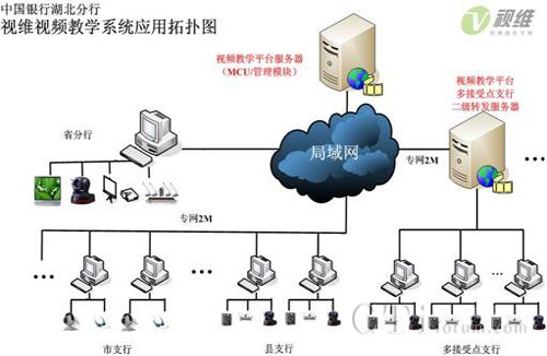 中國(guó)銀行湖北分行的視頻教學(xué)系統(tǒng)由服務(wù)器端和客戶(hù)端組成,服務(wù)器端軟件部署在省分行中心機(jī)房,配置2臺(tái)服務(wù)器,對(duì)于接受點(diǎn)超過(guò)5個(gè)的分支機(jī)構(gòu)配置二級(jí)轉(zhuǎn)發(fā)服務(wù)器,共支持全省各支行及支行內(nèi)多個(gè)客戶(hù)端同時(shí)在線(xiàn),負(fù)責(zé)所有培訓(xùn)的召集、音視頻交互、加密等工作,各支行通過(guò)WEB方式即可實(shí)現(xiàn)客戶(hù)端軟件的自動(dòng)安裝與升級(jí),輕松實(shí)現(xiàn)實(shí)現(xiàn)省分行以及各支行共77余個(gè)接受點(diǎn)的高清音視頻視頻教學(xué)。同時(shí)為中國(guó)銀行湖北分行的視頻教學(xué)系統(tǒng)配置異構(gòu)兼容模塊,支持與其他視頻會(huì)議及軟、硬件視頻教學(xué)系統(tǒng)無(wú)縫融合,避免重復(fù)投資造成的浪費(fèi)。網(wǎng)絡(luò)拓?fù)鋱D如下: