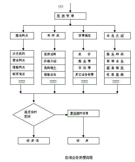 咨詢主要是回答客戶有關(guān)臺席各項業(yè)務(wù)種類、資費標準、服務(wù)網(wǎng)點及優(yōu)惠措施等問題,要求以自編數(shù)據(jù)庫或業(yè)務(wù)手冊為基礎(chǔ),實時予以回答。一時無法解釋清楚的,建議客戶留下聯(lián)系電話,將由專人負責答復(fù)。