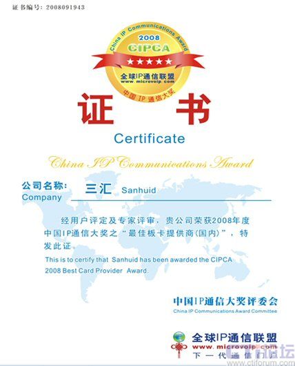 9月19日,在上海盛大舉行的CIPCC中國IP通信大會(huì)上,杭州三匯摘取了CIPCA 2008年國內(nèi)最佳語音板卡提供商大獎(jiǎng),體現(xiàn)了杭州三匯在國內(nèi)語音卡領(lǐng)域的絕對領(lǐng)導(dǎo)和優(yōu)勢地位。
