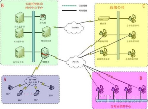 方案一:400電話+托管呼叫中心平臺+坐席分布在總部和分布點