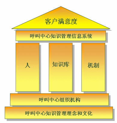 如上圖呼叫中心知識管理大廈。其是建立在呼叫中心知識管理理念文化、組織機(jī)構(gòu)基礎(chǔ)上,以人、知識庫、機(jī)制為核心,通過呼叫中心知識管理信息系統(tǒng)承載實(shí)施,以提高客戶滿意度為目的的綜合系統(tǒng)。