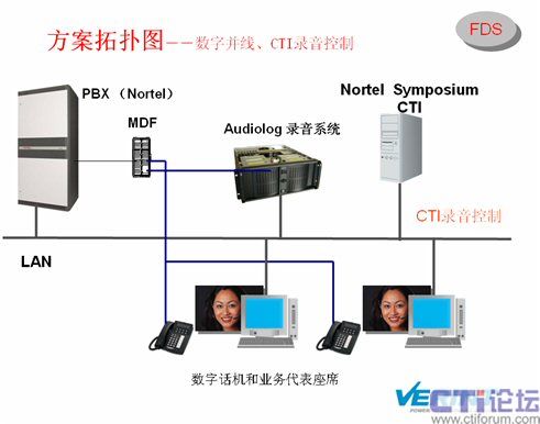 Audiolog錄音系統(tǒng)能和Nortel交換機(jī)、Symposium CTI進(jìn)行整合,并從中拿到錄音檢索參數(shù),便于用戶檢索。