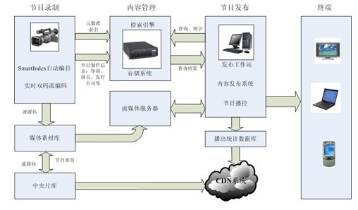 節(jié)目制作平臺(tái)主要負(fù)責(zé)節(jié)目的采編,接收節(jié)目源的數(shù)字視頻信號(hào)和模擬視頻信號(hào)進(jìn)行實(shí)時(shí)/超實(shí)時(shí)的轉(zhuǎn)碼,并同時(shí)進(jìn)行自動(dòng)編目、歸檔,滿足系統(tǒng)不同應(yīng)用的要求。另外,各資源建設(shè)成員單位或各地、州、市遠(yuǎn)程辦按照省遠(yuǎn)程辦的統(tǒng)一部署,加工各自類別的課件,采用人工傳送介質(zhì)或利用VPN實(shí)現(xiàn)專網(wǎng)的方式送交到資源庫系統(tǒng)中,實(shí)施統(tǒng)一的存儲(chǔ)和管理。