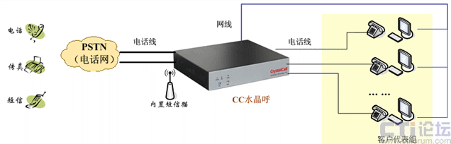 CC水晶呼單獨(dú)組網(wǎng),對(duì)外接運(yùn)營(yíng)商的電話線,對(duì)內(nèi)接分機(jī)線,組網(wǎng)說明如下: