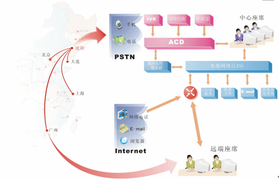對于地區(qū)分布廣泛,而又要集中管理的企業(yè),可在各個局部地區(qū)設置遠端座席,并通過網(wǎng)絡方便的接入中心系統(tǒng)。我們?yōu)檫h端座席提供與中心座席完全相同的操作,遠端座席可以根據(jù)各個地區(qū)的特定情況有針對性的處理各個局部地區(qū)的業(yè)務,為中心分流壓力,同時中心系統(tǒng)也可以完全掌握遠端座席的情況。我們可以非常明確的一點是:采用分布式座席的技術,使得遠端座席與中心座席除了地域上的差異,其它部分完全相同?梢哉f只要網(wǎng)絡無極限,座席分布就是無極限的。