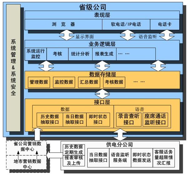 客服監(jiān)管系統(tǒng)中省級公司部分通過接口層與供電公司的客戶服務(wù)系統(tǒng)交換數(shù)據(jù)。通過業(yè)務(wù)邏輯層對接收到的數(shù)據(jù)進(jìn)行處理、展現(xiàn),并且處理要發(fā)送的數(shù)據(jù),在此實(shí)現(xiàn)所有的業(yè)務(wù)邏輯。供電公司部分負(fù)責(zé)提供歷史的和當(dāng)天的各種業(yè)務(wù)數(shù)據(jù)。整個(gè)結(jié)構(gòu)中也考慮到了數(shù)據(jù)中心,數(shù)據(jù)中心建立后將定期導(dǎo)入各供電公司客戶服務(wù)系統(tǒng)的歷史數(shù)據(jù),并提供給省級公司包括監(jiān)管系統(tǒng)在內(nèi)的各種應(yīng)用系統(tǒng)使用。