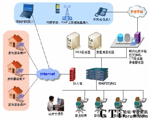 隨著國內(nèi)城市化地不斷加快,人口老齡化的加劇,人民群眾對家政服務(wù)需求也越來越旺盛,家政服務(wù)業(yè)的重要性也日益凸顯。為了規(guī)范家政服務(wù)市場、整合家政市場資源、培育家政服務(wù)示范性企業(yè),國家商務(wù)部、財務(wù)部于2009年4月下發(fā)了《關(guān)于推進家政服務(wù)網(wǎng)絡(luò)體系建設(shè)的通知》的149號文件,啟動了家政服務(wù)網(wǎng)絡(luò)中心體系建設(shè)的項目,并提出了具體的規(guī)范和要求。以此為起點,為更好地服務(wù)社會滿足人民群眾日益增長的生活需求而努力。自文件下發(fā)以來,我公司就組織專門的項目組,對家政服務(wù)行業(yè)具體業(yè)務(wù)需求的調(diào)研以及開發(fā)工作。公司利用多年的開發(fā)經(jīng)驗,經(jīng)過幾個月的努力,終于在8月份完成了暢信達家政服務(wù)網(wǎng)絡(luò)中心的全套建設(shè)方案。與其它系統(tǒng)固化的功能設(shè)計不同,該方案可以靈活地定制業(yè)務(wù)模塊,方便各地的家政公司根據(jù)本市的情況和需求,確定適合自身的業(yè)務(wù)流程。系統(tǒng)業(yè)務(wù)模塊完整地覆蓋了家政服務(wù)的業(yè)務(wù)范圍與重點。并將家政服務(wù)的業(yè)務(wù)分為營業(yè)系統(tǒng)、賬務(wù)系統(tǒng)、后臺系統(tǒng)等部分,貫穿了市民從訴求提交、工單派發(fā)、工單處理、財務(wù)結(jié)算到回訪反饋的各個方面。系統(tǒng)還提供了完善的報表模塊準確反映業(yè)務(wù)和系統(tǒng)運營狀況,有力地支持對平臺進行運營管理工作。另外在方案設(shè)計上,除了滿足業(yè)務(wù)處理需要外,還充分考慮到系統(tǒng)的適應(yīng)性、穩(wěn)定性和處理的能力。首先為了滿足各地市對家政平臺的不同需求,公司專門推出了基于IBM服務(wù)器的和暢信達標配服務(wù)器的兩種建設(shè)方案。暢信達標配服務(wù)器方案可提供最低4模擬外線最多1條數(shù)字中繼(E1)接入,適用于初期規(guī)模較小且投資規(guī)模不大的客戶。而基于IBM服務(wù)器的方案,則主要是滿足業(yè)務(wù)量較大,同時對設(shè)備配置要求高的城市,以數(shù)字線接入為主。多種建設(shè)模式充分體現(xiàn)了方案的靈活性、可擴展性的特征,有效地減少了運營風險,提升了個性化定制化服務(wù)的水平。其次,根據(jù)家政市場需求預測以及已開通家政服務(wù)網(wǎng)絡(luò)中心城市的實際運營情況,一個中型城市,預計電話開通之后,話務(wù)量平均每天近3000個,這就要求系統(tǒng)不但有穩(wěn)定的性能而且要有強大的處理能力。我公司從系統(tǒng)平臺構(gòu)建、業(yè)務(wù)流程設(shè)計、設(shè)備性能、組網(wǎng)設(shè)計等方面著手,為系統(tǒng)提供了足以確保安全穩(wěn)定運行的支持。