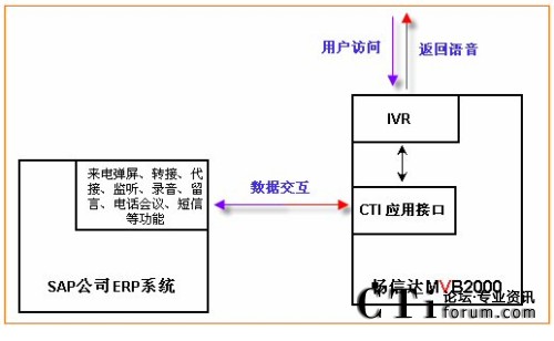 通過集成,不但可以實現(xiàn)與SAP公司ERP系統(tǒng)的實時數(shù)據(jù)傳輸,實現(xiàn)客戶管理、日常辦公,并且可使ERP系統(tǒng)上具有:點擊外呼、批量外呼、來電彈屏、收聽錄音、查看報表、監(jiān)控電話線路等更多增值功能,詳細(xì)接口內(nèi)容見《MVB2000 WEB開發(fā)接口》。