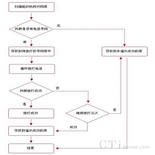 催辦業(yè)務(wù)負責(zé)完成語音提示。系統(tǒng)自動掃描組織機構(gòu)代碼庫,查詢當(dāng)日需要年檢的組織機構(gòu)代碼信息,對沒有電話號碼的存入到未催辦的組織機構(gòu)代碼庫中,有電話號碼的存入到待催辦的電話號碼庫中,并根據(jù)設(shè)置的時間撥打手機號碼,對于語音提示成功的,存放到相應(yīng)的庫中。催辦業(yè)務(wù)后臺功能包括: