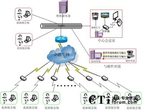 根據(jù)上圖可以知道,在全南縣信用社中心機(jī)房部署一臺(tái)視頻服務(wù)器,這臺(tái)視頻服務(wù)器主要提供各個(gè)會(huì)場(chǎng)進(jìn)行召開(kāi)會(huì)議訪問(wèn),同時(shí)提供遠(yuǎn)程對(duì)系統(tǒng)管理和維護(hù)功能;在全南縣信用社硬件視頻會(huì)議室部署一臺(tái)帶有采集卡PC主機(jī),這臺(tái)PC用和硬件視頻會(huì)議對(duì)接,由硬件視頻會(huì)議提供一路視頻和一路音頻輸出信號(hào),再把硬件提供輸出視頻信號(hào)接入PC主機(jī)上采集卡上,輸出音頻信號(hào)接入PC主機(jī)聲卡麥克風(fēng)上,這樣只要開(kāi)會(huì)是把這臺(tái)PC主機(jī)訪問(wèn)視頻服務(wù)器登錄會(huì)議室其它會(huì)場(chǎng)就可以收聽(tīng)收看到硬件視頻會(huì)議會(huì)內(nèi)容。其它各個(gè)支行和網(wǎng)點(diǎn)會(huì)場(chǎng)通過(guò)金融專網(wǎng)訪問(wèn)視頻服務(wù)器,就可以參加會(huì)議、培訓(xùn)、討論交流問(wèn)題等功能。