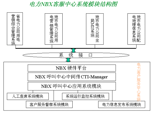該方案以美國3COM公司的NBX產(chǎn)品為系統(tǒng)平臺,結(jié)合其配套的中間件產(chǎn)品CTI-Manager和上層第三方專業(yè)的電力行業(yè)應用系統(tǒng),為各省、市電業(yè)公司建立起新型的電力呼叫中心(Call Center)。使電力客服中心系統(tǒng)以呼叫中心為基礎(chǔ),以電力系統(tǒng)其他后方資源信息(CIS,DMS,負控等系統(tǒng))為依托,為客戶提供電話、傳真、郵件、Internet等多種接入方式,通過和電力其他業(yè)務系統(tǒng)有機的結(jié)合,滿足客戶不同層次、個性化與多樣化的業(yè)務需求,提供了包括錄音、會議電話、統(tǒng)一消息和智能路由在內(nèi)的多種功能。