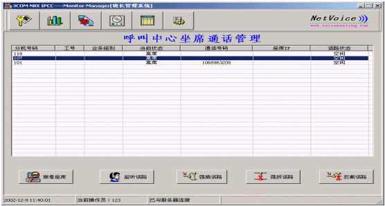 系統(tǒng)提供實時直觀的監(jiān)控界面,并提供各類實用的坐席監(jiān)控方法如:監(jiān)聽、強插、強拆等功能操作,從而實現(xiàn)了對各應(yīng)用坐席的強有力的監(jiān)控、管理功能。