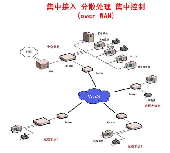 隨著用戶分支機(jī)構(gòu)的不斷發(fā)展壯大,建立一套完全基于IP網(wǎng)絡(luò)的分布式的呼叫中心系統(tǒng),正成為企業(yè)全面提升自身客戶服務(wù)質(zhì)量的一條重要途徑。在前幾年的呼叫中心建設(shè)熱潮過后,現(xiàn)在的市場越來越趨向于理性,目前的企業(yè)往往都處在轉(zhuǎn)變之中,如何最大限度地利用現(xiàn)有的網(wǎng)絡(luò)資源和已有的設(shè)備資源,如何以最低的投資成本獲得最有效的客戶服務(wù)手段才是企業(yè)的選擇根本。企業(yè)的需求決定了呼叫中心行業(yè)的發(fā)展方向,網(wǎng)絡(luò)化、分布化、經(jīng)濟(jì)化、完全基于IP的華為-3Com NBX呼叫中心平臺越來越受到企業(yè)的歡迎,已經(jīng)成為企業(yè)構(gòu)建IP分布式客戶服務(wù)系統(tǒng)的首選品牌。基于網(wǎng)絡(luò)化的NBX呼叫中心:
