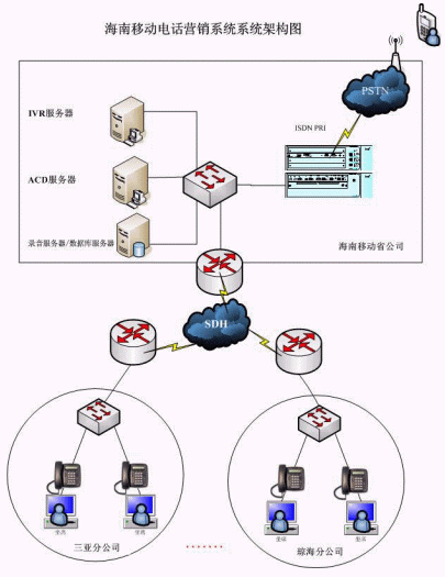 此次為電話營(yíng)銷系統(tǒng)一期工程,在省公司部署一套NBX V5000系統(tǒng)及相應(yīng)的CTI服務(wù)器,通過2條E1接入PSTN,在18個(gè)地市直接部署50個(gè)IP電話終端及坐席端軟件,語(yǔ)音走移動(dòng)已有的MDCN網(wǎng)絡(luò),一個(gè)集中受理分布處理的呼叫中心系統(tǒng)就建設(shè)起來啦,本次工程從設(shè)備到貨、系統(tǒng)上線試運(yùn)行,僅僅用了1個(gè)星期,我們海南移動(dòng)公司的項(xiàng)目經(jīng)理都驚訝的說"太快啦啦,要是使用傳統(tǒng)的排隊(duì)機(jī)部署一個(gè)分布全省的類似系統(tǒng),少說工期也得幾個(gè)月"。經(jīng)過1個(gè)月的試運(yùn)行,系統(tǒng)運(yùn)行穩(wěn)定,各項(xiàng)系統(tǒng)指標(biāo)滿足合同要求,在11月份系統(tǒng)順利通過初驗(yàn)。