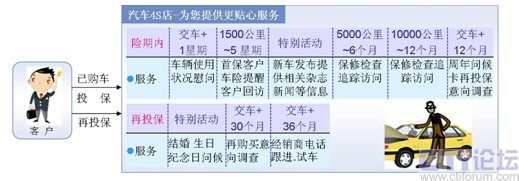 根據(jù)詳細(xì)的客戶或交易信息(如生日、性別、愛好、購車記錄、投保記錄等)主動與客戶通過電話、短信等方式,進(jìn)行客戶回訪、投保到期再保提醒、生日祝福、節(jié)日問候、再保后的關(guān)懷等服務(wù),與客戶建立良好的長期關(guān)系。