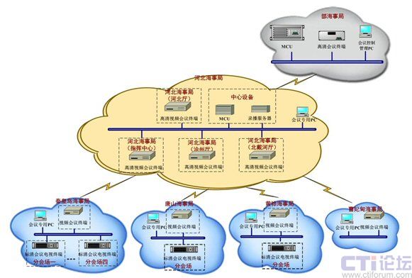 由于前期視頻會議系統(tǒng)測試時表現(xiàn)出來的良好的兼容性和出色的視音頻效果,河北海事局采用了迪威公司的高清產(chǎn)品及解決方案。按照組織機(jī)構(gòu)的分級結(jié)構(gòu),部海事局采用現(xiàn)有的高清MCU和本局部的高清終端;河北海事局部署高清MCU,既能召開本地視頻會議,又能與部海事局進(jìn)行級聯(lián),實現(xiàn)召開大會的要求,同時在本地的指揮中心、各會場放置1臺高清會議終端,在下屬海事處配置1臺標(biāo)清會議終端。