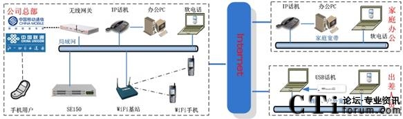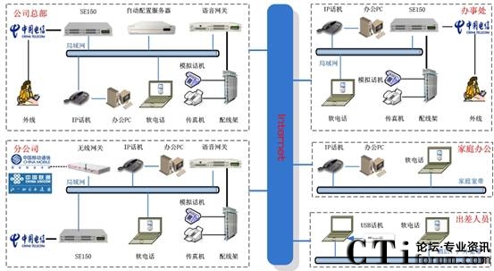此方案適用于具有“移動辦公、頻繁出差、家庭辦公”需求的企業(yè)。系統(tǒng)要求企業(yè)內(nèi)部部署好數(shù)據(jù)網(wǎng)絡(luò),如果采用模擬終端,則企業(yè)的各個辦公點(diǎn)需要先將網(wǎng)絡(luò)線路和電話線路部署到位。如果需要應(yīng)用WIFI終端,則需要部署WIFI網(wǎng)絡(luò)。