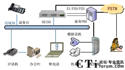 此方案適用于已經(jīng)部署了傳統(tǒng)PBX的企業(yè)。要求企業(yè)部署好數(shù)據(jù)網(wǎng)絡(luò),如果采用模擬終端,則企業(yè)的各個辦公點(diǎn)需要先將網(wǎng)絡(luò)線路和電話線路部署到位,同時企業(yè)原有的PBX要預(yù)留與SE150對接的接口。