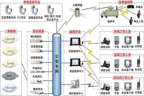 系統(tǒng)基于公安專網(wǎng)部署,融合衛(wèi)星網(wǎng)絡、PSTN、GSM/CDMA、集群對講網(wǎng)絡等各種網(wǎng)絡,采用專業(yè)的多媒體調度平臺實現(xiàn)省、市、縣各級公安機關之間的互聯(lián)互通和多級指揮調度,實現(xiàn)語音、視頻、數(shù)據(jù)的同步傳輸和統(tǒng)一調度。并能和公安部門現(xiàn)有各種業(yè)務系統(tǒng),如視頻監(jiān)控系統(tǒng)、接處警系統(tǒng)、GIS系統(tǒng)、應急預案系統(tǒng)、數(shù)據(jù)庫系統(tǒng)等集成,實現(xiàn)多系統(tǒng)相互調用,協(xié)同工作。