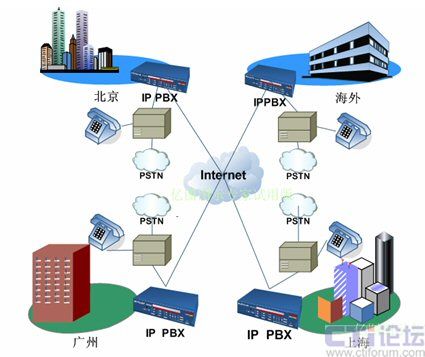 各分支機構(gòu)租用獨立的電話號碼并接入當(dāng)?shù)豍STN,在這種架構(gòu)下,各地之間通話就會產(chǎn)生長途費用,并占用電話線路,但如果使用IP